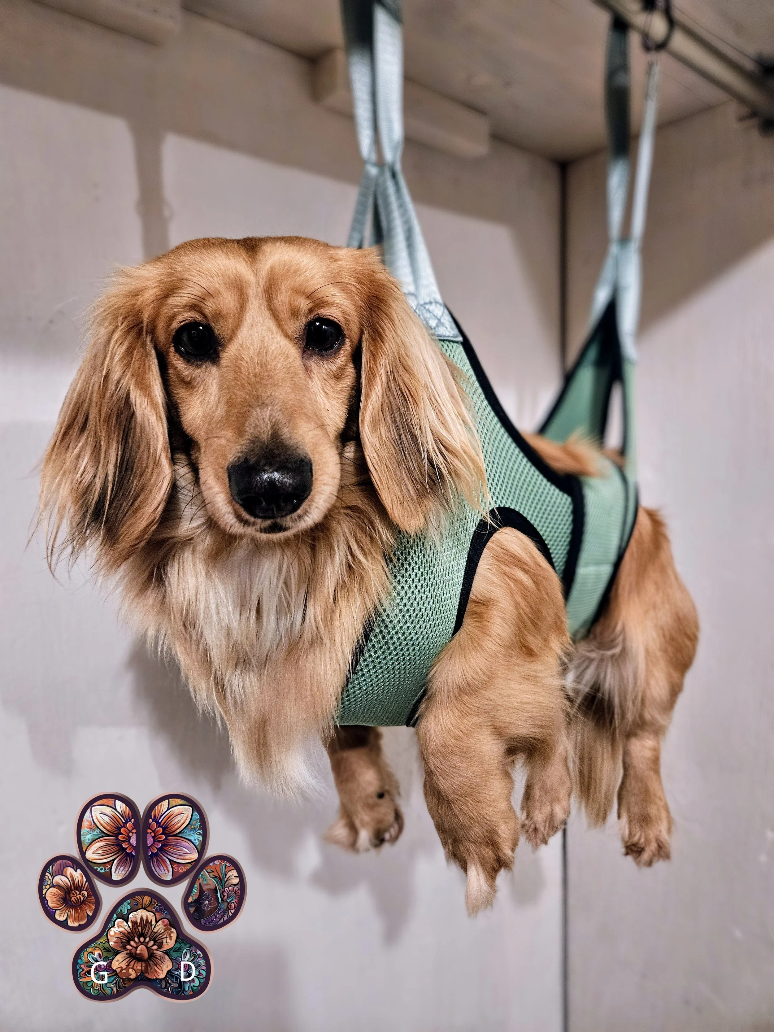 We found a special sling made for Dachshund’s long bodies!
