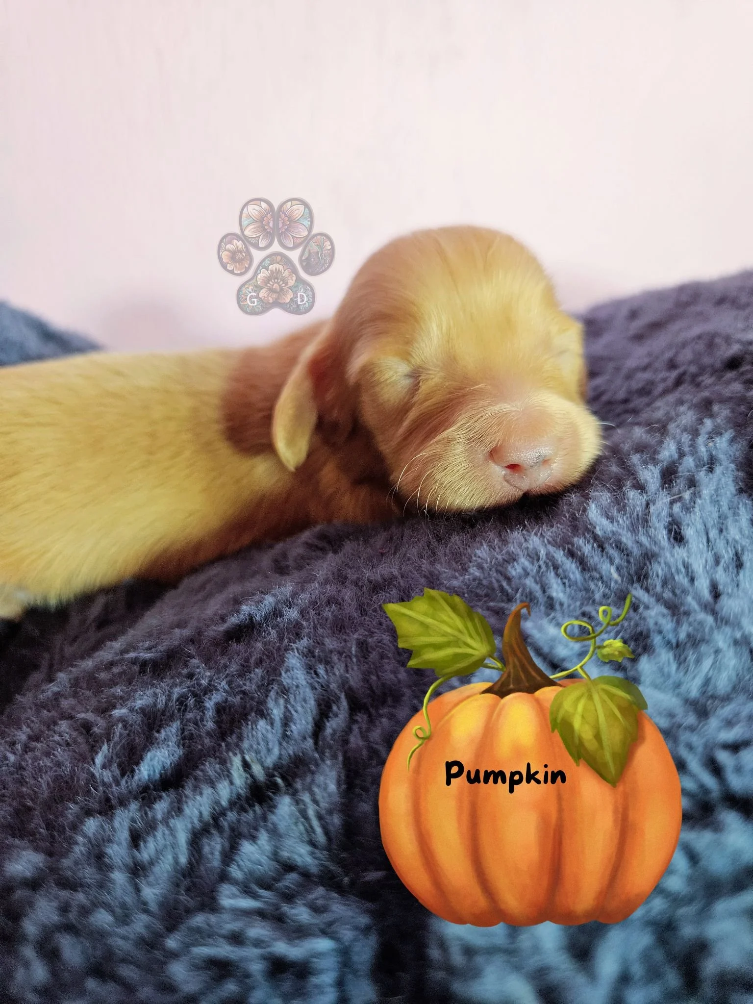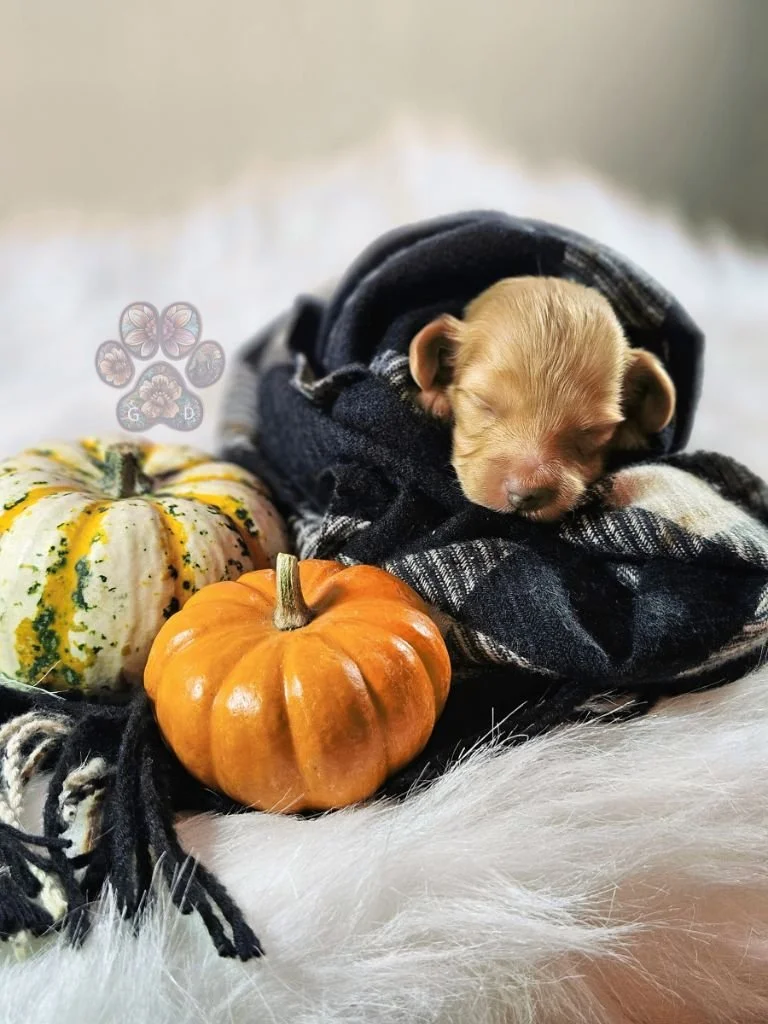 Pumpkin is an adorable cream/light red baby boy. He is already a cuddler and is too cute with his golden coat. He is the smallest pup in his litter and ready to be your best friend. He will be ready to go to his new home November 21, just in time for the holidays.